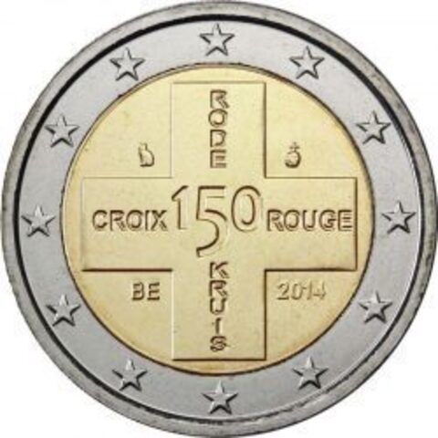В центре внутреннего диска изображён равносторонний крест с надписями: по горизонтальной перекладине на французском языке — «CROIX 150 ROUGE», по вертикальной на нидерландском — «RODE 150 KRUIS». В углах креста расположены знаки генерального директора монетного двора (Bernard Gillard, кошка) и самого монетного двора (голова ангела Михаила), обозначение государства-эмитента «BE» и год эмиссии монеты «2014».