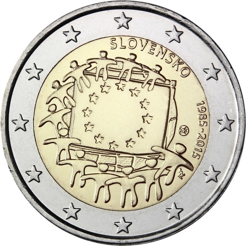Аверс: Флаг ЕС в обрамлении двенадцати стилизованных человеческих фигур, название страны-эмитента и годы: «1985-2015».