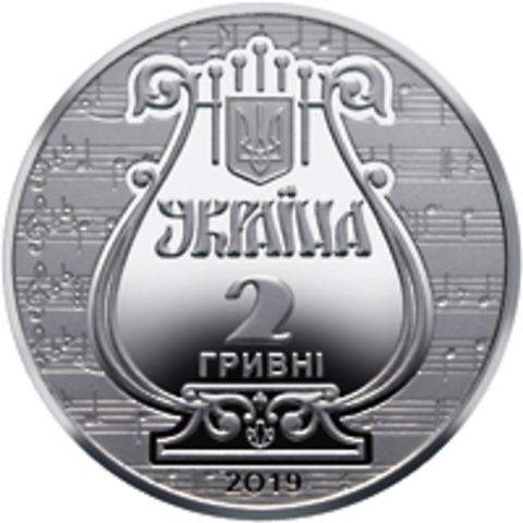 На аверсе монеты размещена стилизованная композиция: на фоне нотных строк изображен музыкальный инструмент – лиру, вверху которой – малый Государственный Герб Украины, под ним надписи: УКРАИНА/2/ГРИВНЫ; внизу: логотип Банкнотно-монетного двора Национального банка Украины и год чеканки монеты – 2019.
