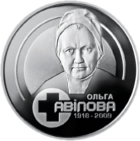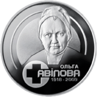 Реверс: изображен портрет Ольги Авиловой, под которым надписи: ОЛЬГА АВИЛОВА 1918 - 2009.