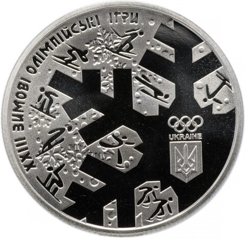Аверс: справа - фрагмент стилизованной снежинки, в центре которой, - знак Национального олимпийского комитета Украины, между кристаллами снежинки на матовом фоне размещены пиктограммы, символизирующие зимние виды спорта; слева - надпись полукругом - ХХІІ ЗИМНИЕ ОЛИМПИЙСКИЕ ИГРЫ.