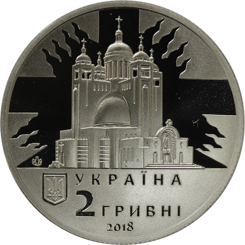 Аверс: Патриарший собор Воскресения Христова (н. Киев) на зеркальном фоне стилизованного крестообразного лучи; внизу - малый Государственный Герб Украины, справа от которого надписи: УКРАИНА/ 2 грн/2018; логотип Банкнотно-монетного двора Национального банка Украины (на зеркальном фоне, слева от собора).