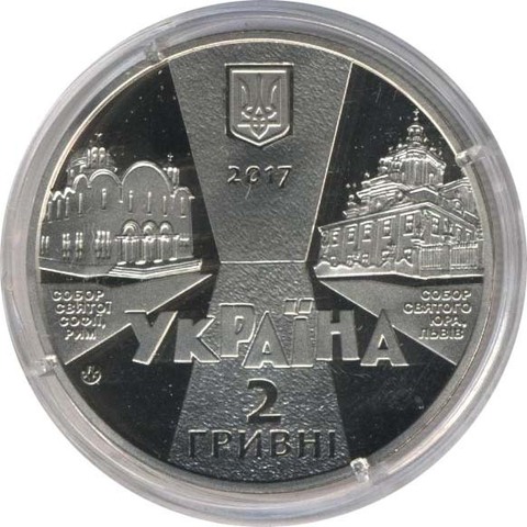 Аверс: вверху малый Государственный Герб Украины, под которым год чеканки монеты 2017, надпись УКРАИНА и номинал 2/ГРИВНЫ; на зеркальном фоне изображено: слева - римский собор (построен при содействии Иосифа Слепого), под которым надписи: СОБОР/СВЯТОЙ/СОФИИ/РИМ; справа - львовский собор, под которым надписи: СОБОР/СВЯТОГО/ ЮРА,/ЛЬВОВ (собор Галицкой митрополии УГКЦ, возглавляемой митрополитом Иосифом Слепым, в котором покоится его прах); логотип Банкнотно-монетного двора Национального банка Украины (слева).