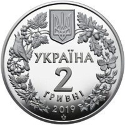 На аверсе размещены малый Государственный Герб Украины, надписи: "УКРАЇНА / 2 / ГРИВНІ / 2019" и логотип Банкнотно-монетного двора НБУ. Все это добро обрамляет венок, составленный из изображений разнообразных фрагментов флоры и фауны.