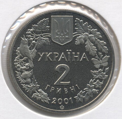 На аверсе монет в обрамлении венка, образованного из изображений отдельных видов флоры и фауны, размещен малый Государственный Герб Украины и надписи в четыре строки: УКРАИНА, 2, ГРИВНЫ, 2001 и логотип Монетного двора Национального банка Украины.