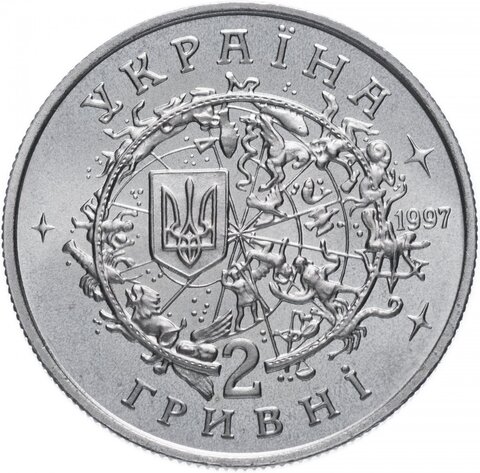 На аверсе монеты в центре на фоне старинной карты звездного неба размещено изображение малого Государственного герба Украины. По окружности вверху надпись УКРАИНА, внизу в две строки 2 ГРИВНИ. Справа дата 1997 - год чеканки монеты. Все надписи отделены друг от друга стилизованными изображениями звезд.