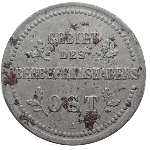 Аверс: надпись в четыре строки «GEBIET DES OBERBEFEHLSHABERS OST» - область главнокомандующего Восточным фронтом, вокруг надписи четыре дубовые веточки, ниже знак Гамбургского монетного двора «A».
