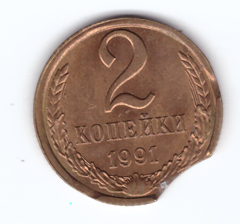 2 копейки 1991 года (Л). Брак - 3 выкуса (1 большой и 2 маленьких) VF-XF