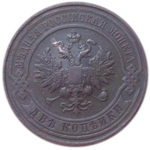 Аверс: вверху вдоль края монеты в выделенной выступающей рамкой полосе надпись «МЕДНАЯ РОССИЙСКАЯ МОНЕТА», внизу вдоль края монеты в выступающей рамке, соединённой с верхней рамкой расположенными слева и справа фигурными решетками, на выступающей плашке вдавленными буквами обозначение номинала монеты «ДВЕ КОПЕЙКИ», в середине Малый Государственный Герб Российской империи.