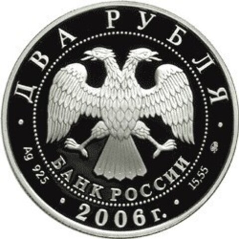 Аверс: вверху вдоль канта номинал «ДВА РУБЛЯ», внизу слева химическое название «Ag» и проба «925» металла, внизу по центру год выпуска «2006 г.», внизу справа чистый вес находящегося в монете драгоценного металла «15,55» и монограмма монетного двора «ММД». В середине в ободке из точек двуглавый орел под ним с внутренней стороны точечного ободка слова «БАНК РОССИИ».