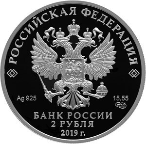 Аверс: расположено изображение государственного герба Российской Федерации, имеются надписи: «РОССИЙСКАЯ ФЕДЕРАЦИЯ», «БАНК РОССИИ», номинал монеты — «2 РУБЛЯ» и дата — «2019 г.», обозначение металла по Периодической системе элементов Д.И. Менделеева, проба сплава, товарный знак Московского монетного двора и масса драгоценного металла в чистоте.