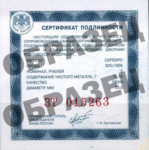 Аверс: вверху вдоль канта номинал «ДВА РУБЛЯ», внизу слева химическое название «Ag» и проба «925» металла, внизу по центру год выпуска «2000 г.», внизу справа чистый вес находящегося в монете драгоценного металла «15,55» и монограмма монетного двора «ММД». В середине в ободке из точек двуглавый орел под ним с внутренней стороны точечного ободка слова «БАНК РОССИИ».