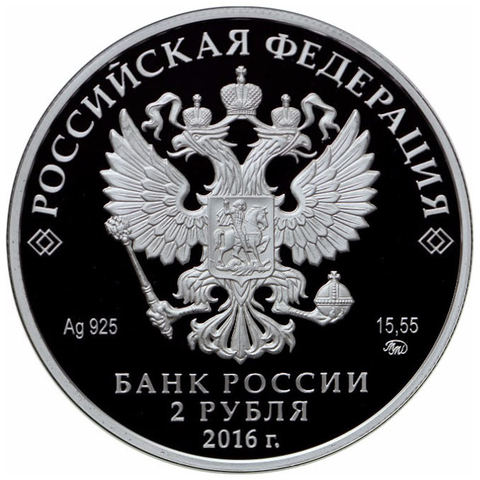 На лицевой стороне монеты расположено рельефное изображение Государственного герба Российской Федерации, имеются надписи: «РОССИЙСКАЯ ФЕДЕРАЦИЯ», «БАНК РОССИИ», номинал монеты — «2 РУБЛЯ» и дата — «2016 г.», обозначение металла по Периодической системе элементов Д И. Менделеева, проба сплава, товарный знак Московского монетного двора и масса драгоценного металла в чистоте.