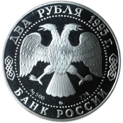 Аверс: вверху вдоль канта обозначение достоинства монеты «ДВА РУБЛЯ», слева и справа под номиналом орнамент, внизу слова «БАНК РОССИИ». В середине двуглавый орел.