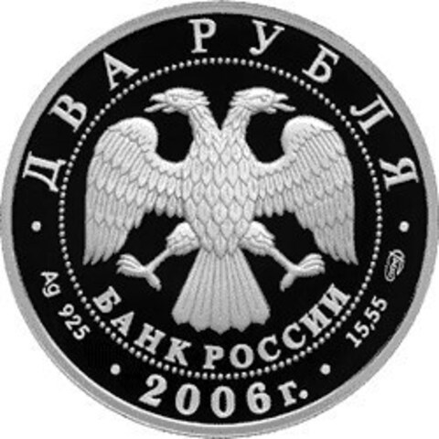 Аверс: вверху вдоль канта номинал «ДВА РУБЛЯ», внизу слева химическое название «Ag» и проба «925» металла, внизу по центру год выпуска «2006 г.», внизу справа чистый вес находящегося в монете драгоценного металла «15,55» и монограмма монетного двора «СПМД». В середине в ободке из точек двуглавый орел под ним с внутренней стороны точечного ободка слова «БАНК РОССИИ».