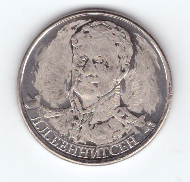 Монета выпущена в 2012 году в честь 200-летия победы в Отечественной Войне 1812 Центральным Банком РФ. Входит в серию из 16 монет под названием «Полководцы и герои Отечественной войны 1812 года». На реверсе изображен портрет генерала от кавалерии Беннигсена, входившего в штаб Кутузова и участвовавшего во многих сражениях.