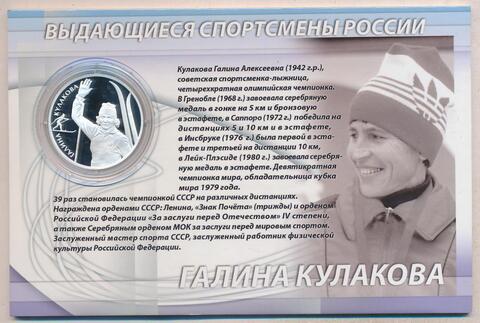 Реверс: в центре диска на зеркальном поле – рельефный портрет Кулаковой Г.А. в спортивной форме с поднятой в приветствии правой рукой, на которой висит лыжная палка, справа – пара поставленных вертикально лыж, слева у канта – надпись полукругом: "ГАЛИНА КУЛАКОВА", разделенная фигуркой бегущей лыжницы.