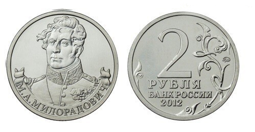 Монета выпущена в 2012 году в честь 200-летия победы в Отечественной Войне 1812 Центральным Банком РФ. Входит в серию из 16 монет под названием «Полководцы и герои Отечественной войны 1812 года». На реверсе изображен портрет генерал-майора Милорадовича, известного своим храбрым характером.