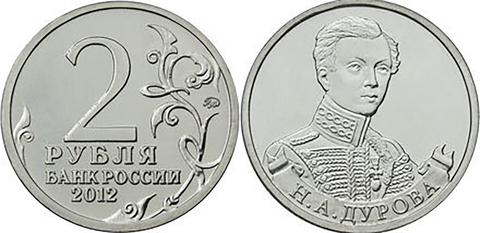 Монета выпущена в 2012 году в честь 200-летия победы в Отечественной Войне 1812 Центральным Банком РФ. Входит в серию из 16 монет под названием «Полководцы и герои Отечественной войны 1812 года». На реверсе изображен портрет адъютанта Кутузова Дуровой, первой женщины-офицера в России.