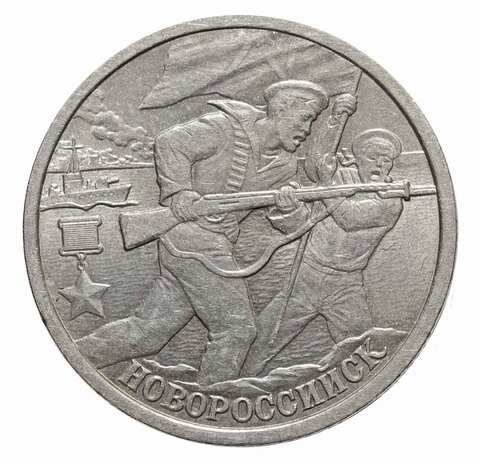 Монета выпущена в 2000 году в честь 55-й годовщины Победы в Великой Отечественной войне 1941-1945 гг Центральным Банком РФ. Входит в серию монет под названием «55-я годовщина Победы в Великой Отечественной войне 1941-1945 гг». Большая часть Новороссийска была захвачена немцами вплоть до освободительной операции. 255 дней советские моряки-десантники отстаивали небольшой участок земли, за что Новороссийску и было присвоено звание города-героя.