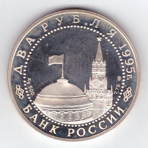 Аверс: вверху вдоль канта номинал «ДВА РУБЛЯ» и год выпуска «1995 г.», внизу слова «БАНК РОССИИ». В середине в ободке из точек изображение Спасской башни Московского Кремля и частично перекрывающего ее купола Сенатского дворца с развевающимся флагом, с внутренней стороны точечного ободка справа монограмма монетного двора «ЛМД».