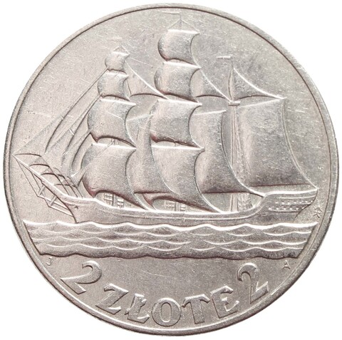 2 злотых. 15 лет морскому порту Гдыня. Парусник. Польша. 1936 год. aUNC