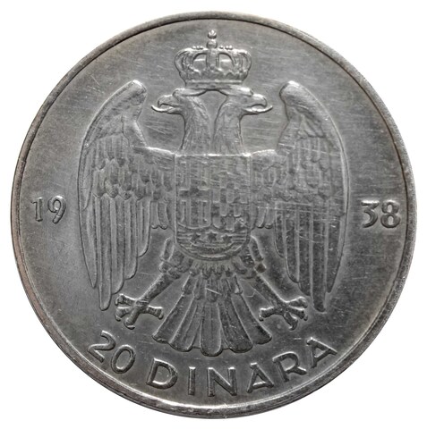 20 динар. Петр II. Югославия. 1938 год. Серебро. VF-XF.