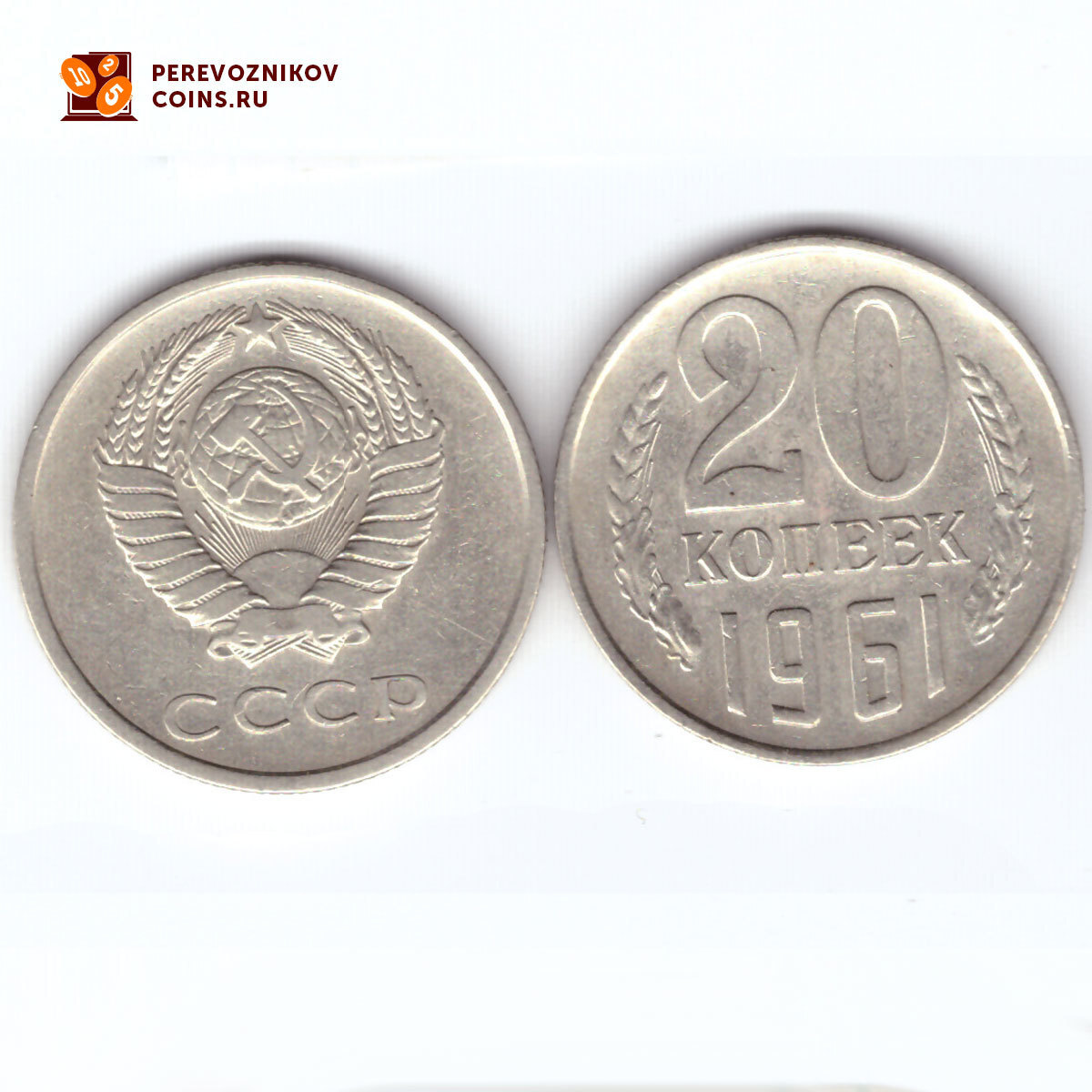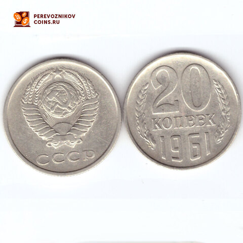 20 копеек 1961 года. Разновидность - Шт.Б (между листьями венка, слева и справа от букв "К", по три линии). VF