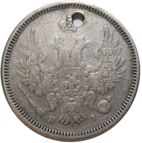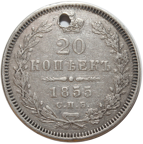 20 копеек. Николай I. СПБ НI. 1855 год. Отверстие