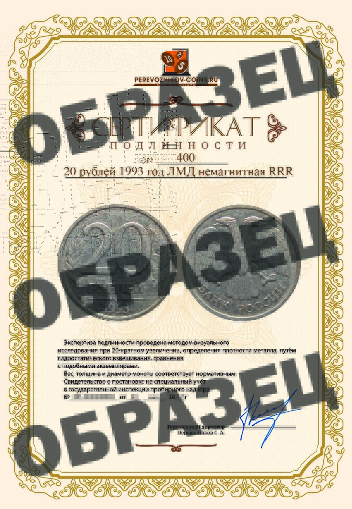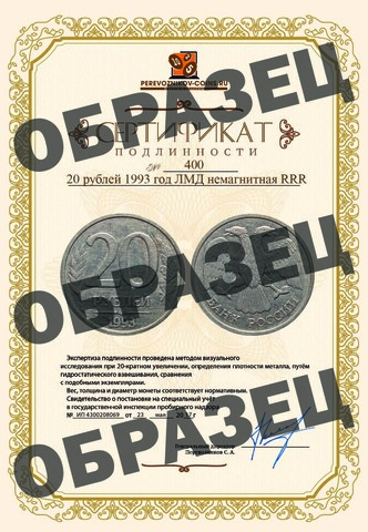 Регулярная, массовая чеканка 20 рублевых монет на ЛМД в 1993 году не производилась. Принципиальный момент, в том, что эта монета кроме того, что отчеканена на мельхиоровой заготовке 1992 года, еще имеет и гуртовое оформление характерное для монет 1992 года, прерывисто - рубчатое, а не гладкое как у всех монет которые отчеканены в 1993 году. Можно предположить, что в данном случае имеет место пробная чеканка произведенная на ЛМД в 1992 году, с использованием приготовленных на будущий, 1993 год штемпелей, но произведенная по технологии 1992 года на медно - никелевых заготовках и с прерывисто - рубчатым загурчиванием.