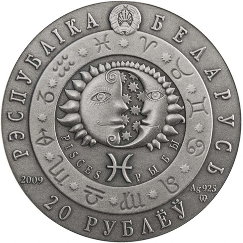 Аверс: В центре, в обрамлении круга, состоящего из 12 символов Знаков зодиака – изображение солнца и луны. Под ними – астрологический знак Рыбы и надписи на латинском и белорусском языках: «PISCES» и «РЫБЫ». В верхней части – рельефное изображение Государственного герба Республики Беларусь. В нижней части, слева – год выпуска (2009), справа – проба сплава (Ag 925) и фирменный (товарный) знак Монетного двора Польши (mw). По кругу – надписи на белорусском языке: «РЭСПУБЛІКА БЕЛАРУСЬ» (страна-эмитент: Республика Беларусь) и «20 РУБЛЁЎ» (номинал: 20 рублей).