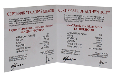 Реверс: в центре – изображение малыша, которого несет аист; внизу – изображение деревенской хаты с растущим позади деревом; внизу по кругу надпись: БАЦЬКОЎСТВА.