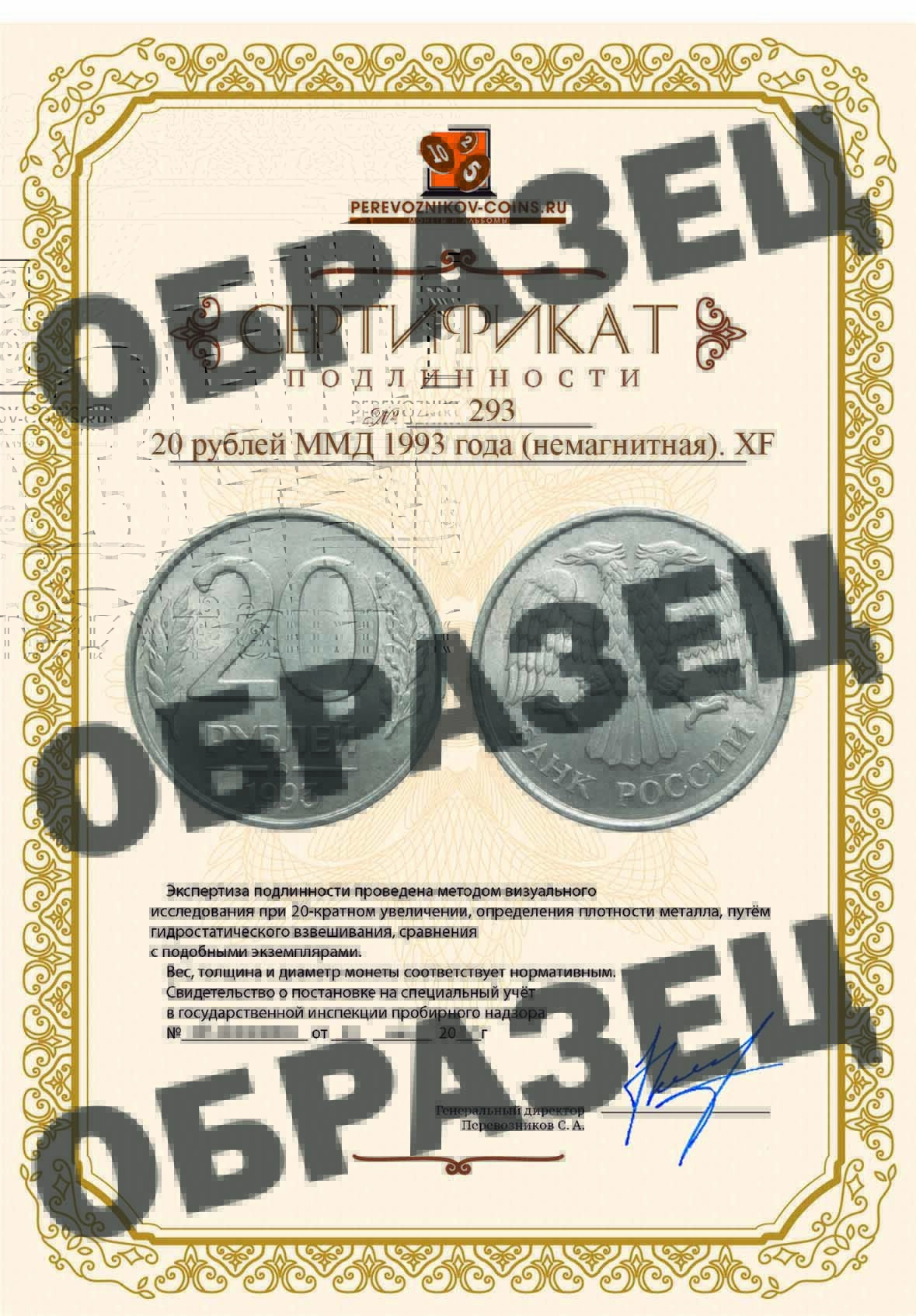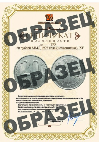 В 1993 году массовая чеканка 20 рублевых монет осуществлялась только на Московском монетном дворе. С этого года для их изготовления использовались стальные заготовки с медно - никелевым покрытием, обладающие магнитными свойствами. Но встречаются и не магнитные 20 рублей ММД 1993 года, отчеканены на медно - никелевых (мельхиоровых) заготовках, полностью соответствующих тем, которые использовались для чеканки 20 рублевых монет в 1992 году. Но которые каким то образом не были отправлены на переплавку, а попали в монетное производство 1993 года и имеют гладкий гурт как и все монеты 1993 года. Т.е. эта "не магнитная" разновидность образовались в результате использования старых монетных заготовок в чеканке 1993 года, её стоимость у коллекционеров достигает 20 - 25 тысяч рублей.