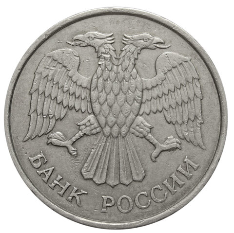 Аверс: в середине двуглавый орел с опущенными крыльями, перья без просечек, внизу надпись «БАНК РОССИИ».