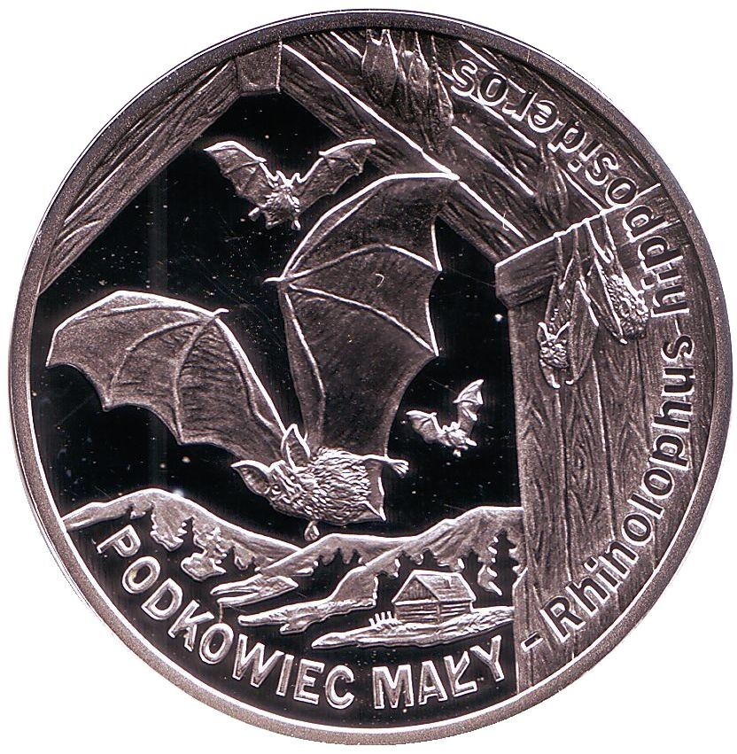 Реверс: в центре изображен подковонос, взмахивающий крыльями для взлета. На заднем плане видны силуэты других летучих мышей, свисающие вниз головой с потолка здания, а также уже вылетевших наружу на охоту. Внизу надпись полукругом: PODKOWIEC MAŁY - Rhinolophus hipposideros.