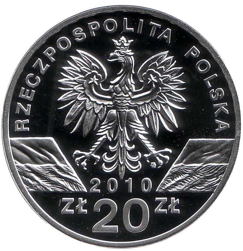 Аверс: в центре – изображение орла, установленного для герба Республики Польша. Под орлом – год чеканки 2010, ниже надпись ZŁ 20 ZŁ. Сверху по кругу – надпись,: RZECZPOSPOLITA POLSKA. Под правой лапой орла – знак монетного двора: M/W. Справа и слева лап орла изображен развевающийся флаг Польши.