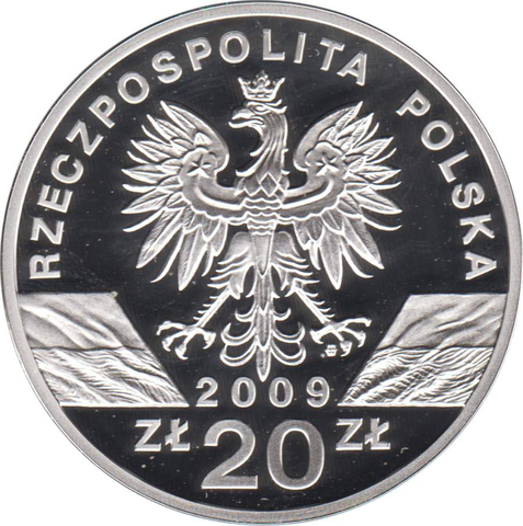 Аверс: в центре – изображение орла, установленного для герба Республики Польша. Под орлом – год чеканки 2009, ниже надпись ZŁ 20 ZŁ. Сверху по кругу – надпись: RZECZPOSPOLITA POLSKA. Под правой лапой орла – знак монетного двора: M/W. Справа и слева лап орла изображен развевающийся флаг Польши.