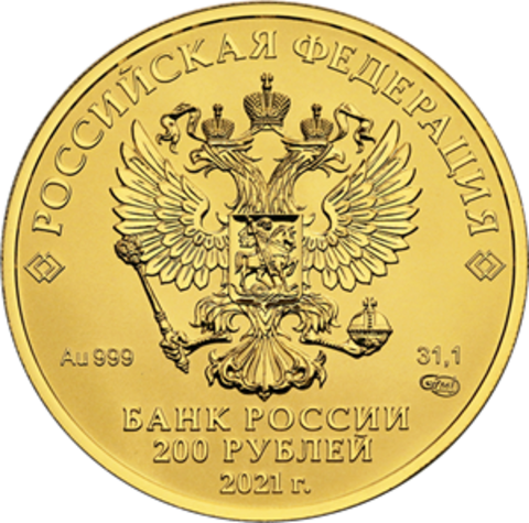 Аверс: На лицевой стороне монет расположено рельефное изображение Государственного герба Российской Федерации, имеются надписи: «РОССИЙСКАЯ ФЕДЕРАЦИЯ», «БАНК РОССИИ», номинал монет и дата, обозначение металла по Периодической системе элементов Д.И. Менделеева, проба сплава, товарный знак Московского монетного двора и масса драгоценного металла в чистоте.