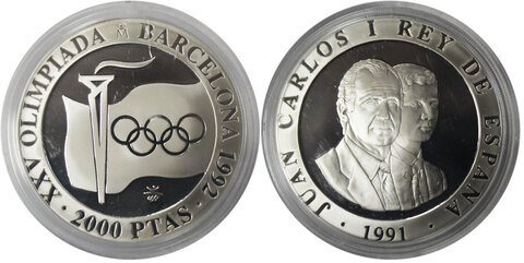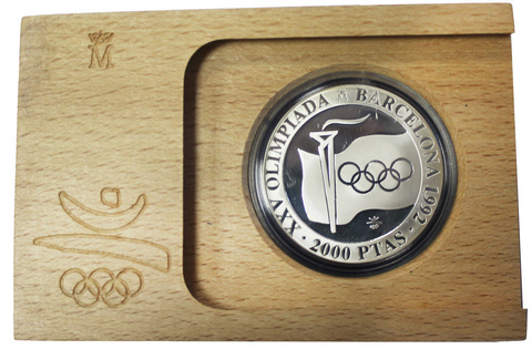 2000 песет 1991 Испания. XXV Летние Олимпийские игры, Барселона 1992 - Факел кольца. Серебро PROOF в родной коробке