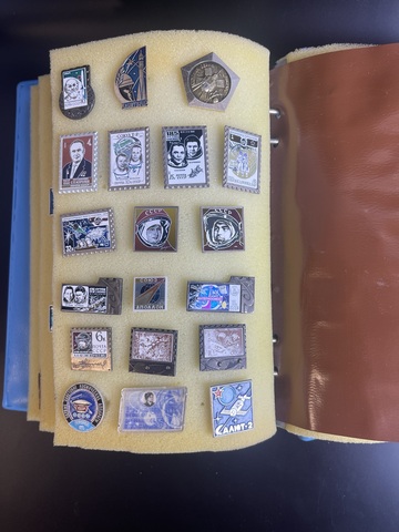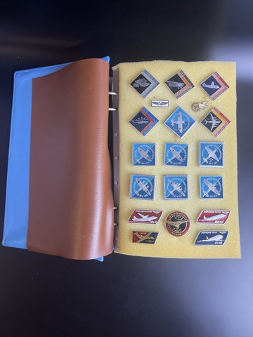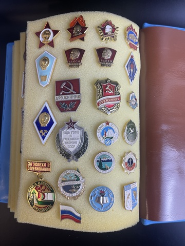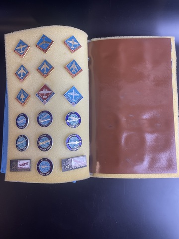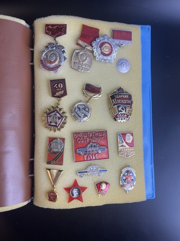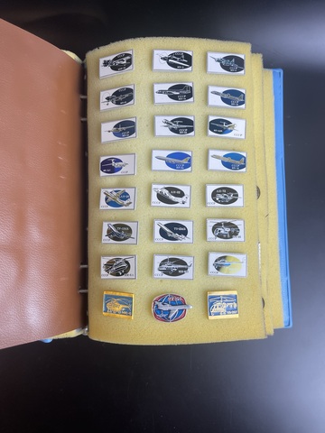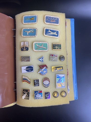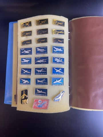 213 значков без повторов в юбилейном альбоме для значков Олимпиада 1980 СССР, Листы поролоновые с промежуточными кожаными листами. На каждом листе значки с двкх сторон. толщина альбома 7 см, высота 23,5 см, ширина 16 см. Первый лист со значками в альбоме на тему Авиация СССР - 37 штук, с обратной стороны вертолеты и самолеты СССР + переливной значок - 49 штук. На втором листе самолеты и вертолеты СССР 24 штуки, на обратной стороне авиация СССР 25 штук. На третьем листе гражданская авиация и космос 23 значка, на обратной стороне тема космос с переливным значком СССР - 19 штук. На четвертом листе нагрудные знаки 50 лет образования СССР , тема ВЛКСМ и тема ГАИ - 14 штук, на обратной стороне листа ВККСМ ударники , технический ВУЗ, гуманитарный техникум и другие - 22 штуки.