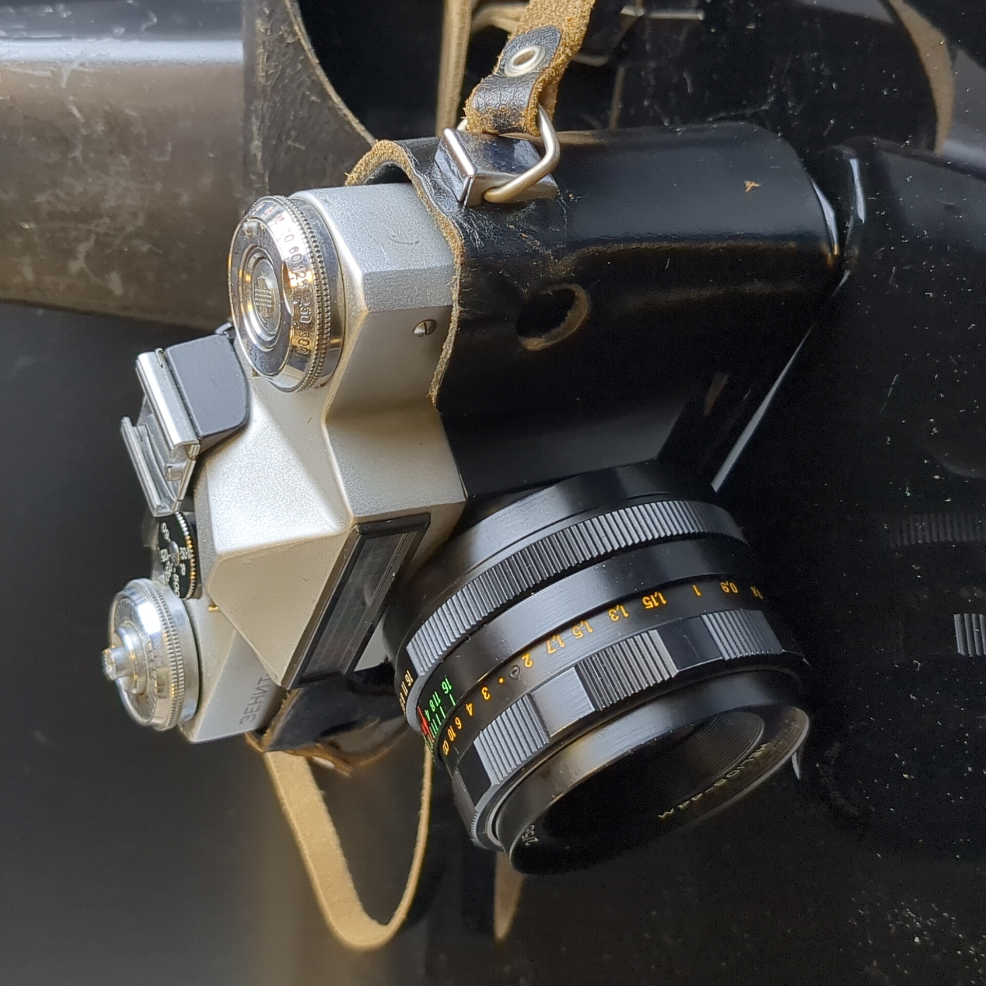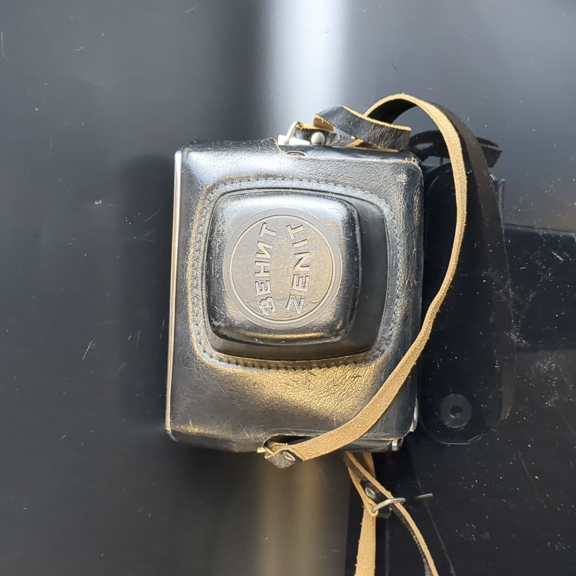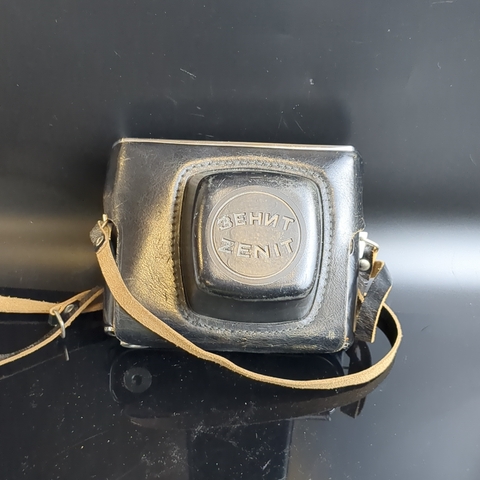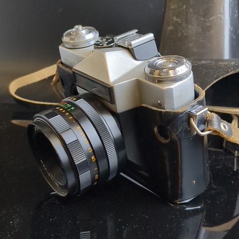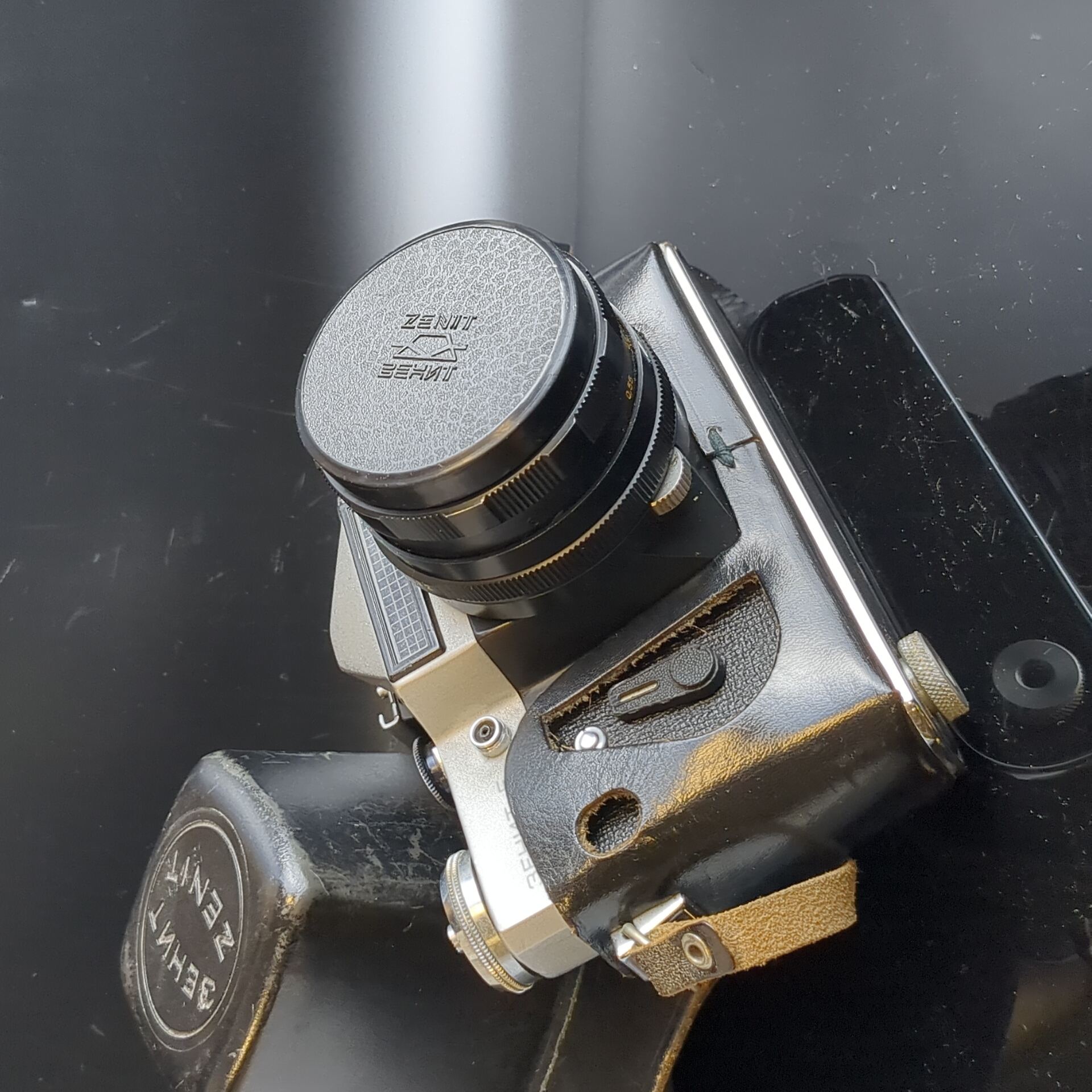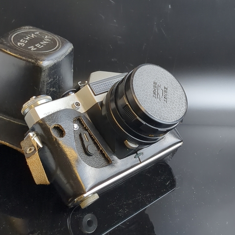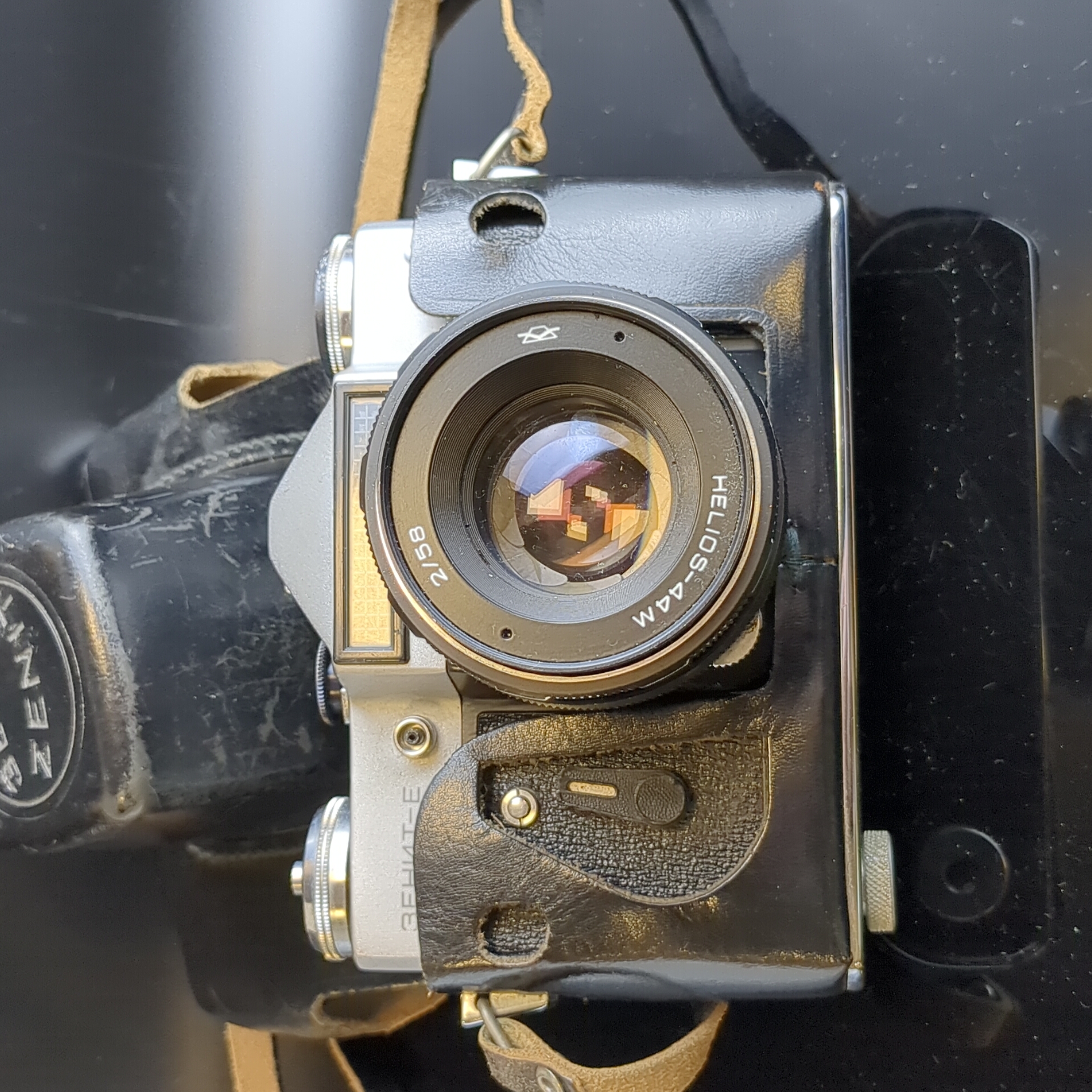 № 22 Фотоаппарат "Зенит-Е" с объективом "Гелиос 44 М", металл, стекло, кожа, пластик, Красногорский механический завод (КМЗ), СССР, 1977 г. Присутствуют следы использования. Состояние на фото