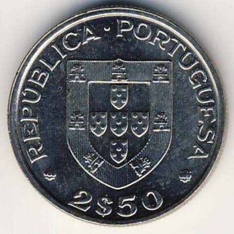 Аверс: в центре монеты португальский герб; вдоль верхнего края: REPUBLICA • PORTUGUESA (Португалия); вдоль нижнего края номинал: 2 $ 50 (ЭСКУДО)