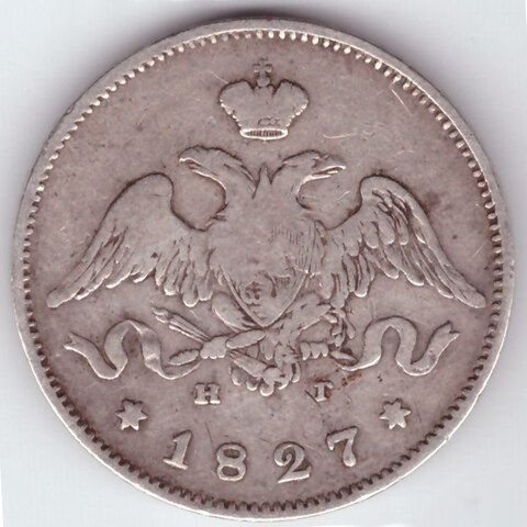 Аверс: В центре изображен Государственный Герб Российской империи - двуглавый орёл с распростёртыми и опущенными вниз крыльями. Над головами орла - императорская корона. На груди орла расположен Московский герб - щит с изображением Георгия Победоносца, поражающего копьем дракона. Орёл держит, перевитые орденской лентой ордена Св. Апостола Андрея Первозванного, громовые стрелы и факел в правой лапе и лавровый венок — в левой. Под лентой буквы: слева «Н», справа «Г». Инициалы минцмейстера Николая Грачева. Под инициалами — дата выпуска монеты «1827», ограниченная с обеих сторон шестиконечными звёздами. По окружности канта имеются рельефные элементы, выполненные в виде зубцов.