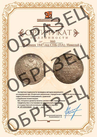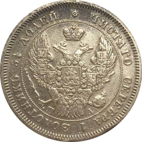 Реверс: вверху монеты корона Российской империи, ниже обозначение номинала цифра «25», под ним слово «КОПЕЕК», ниже две направленные в разные стороны фигурные черты, под ним год выпуска монеты «1847» и ниже обозначение монетного двора «СПБ». Слева вдоль края монеты лавровая ветвь, справа дубовая, внизу ветви пересекаются и перевязаны лентой.