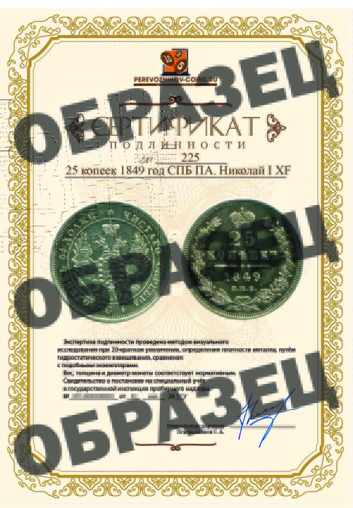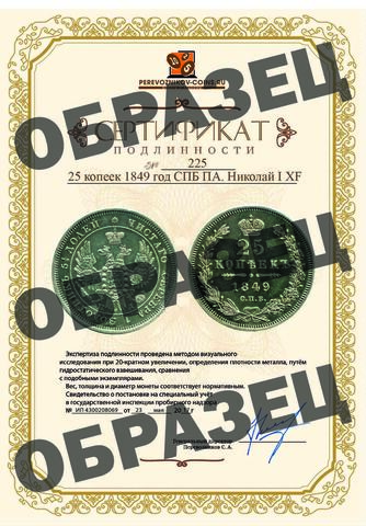 Реверс: В центре указан номинал «25». Над цифрой – Корона Российской империи. Под цифрой номинала — слово "КОПЕЕК". Ниже, расположен декоративный разделитель в виде двух разнонаправленных фигурных линий и небольшой окружности между ними, в центре которой, выпуклая точка. Под разделителем — дата выпуска монеты «1849». Под цифрой даты — обозначение монетного двора «С.П.Б.». Вдоль канта, не доходя до короны, изображен венок из лавровой и дубовой ветви, которые в нижней части перевязаны лентой на узел бантом. По окружности канта имеются рельефные элементы, выполненные в виде зубцов.