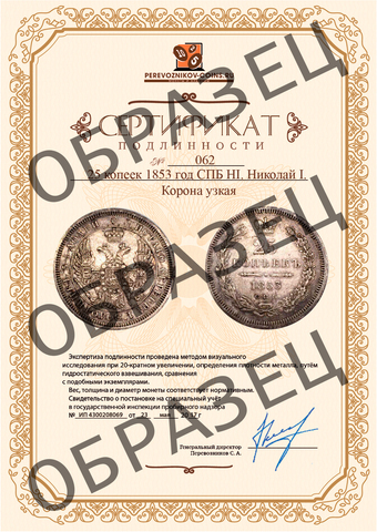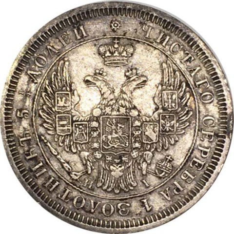 Реверс: вверху монеты корона Российской империи, ниже обозначение номинала цифра «25», под ним слово «КОПЕЕК», ниже две направленные в разные стороны фигурные черты, под ним год выпуска монеты «1853» и ниже обозначение монетного двора «СПБ». Слева вдоль края монеты лавровая ветвь, справа дубовая, внизу ветви пересекаются и перевязаны лентой.