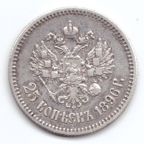 Аверс: в середине Малый Государственный Герб Российской империи, под ним вдоль края монеты слева номинал «25 КОПЕЕК», в середине цветочная розетка, справа выпуска монеты «1896 Г.».