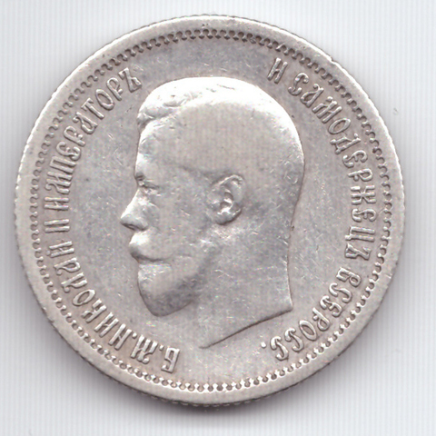 Реверс: слева вдоль края монеты надпись «Б.М. НИКОЛАЙ II ИМПЕРАТОР», справа вдоль края монеты надпись «И САМОДЕРЖЕЦ ВСЕРОСС.», в середине обращенная влево голова Императора Российской империи Николая II.