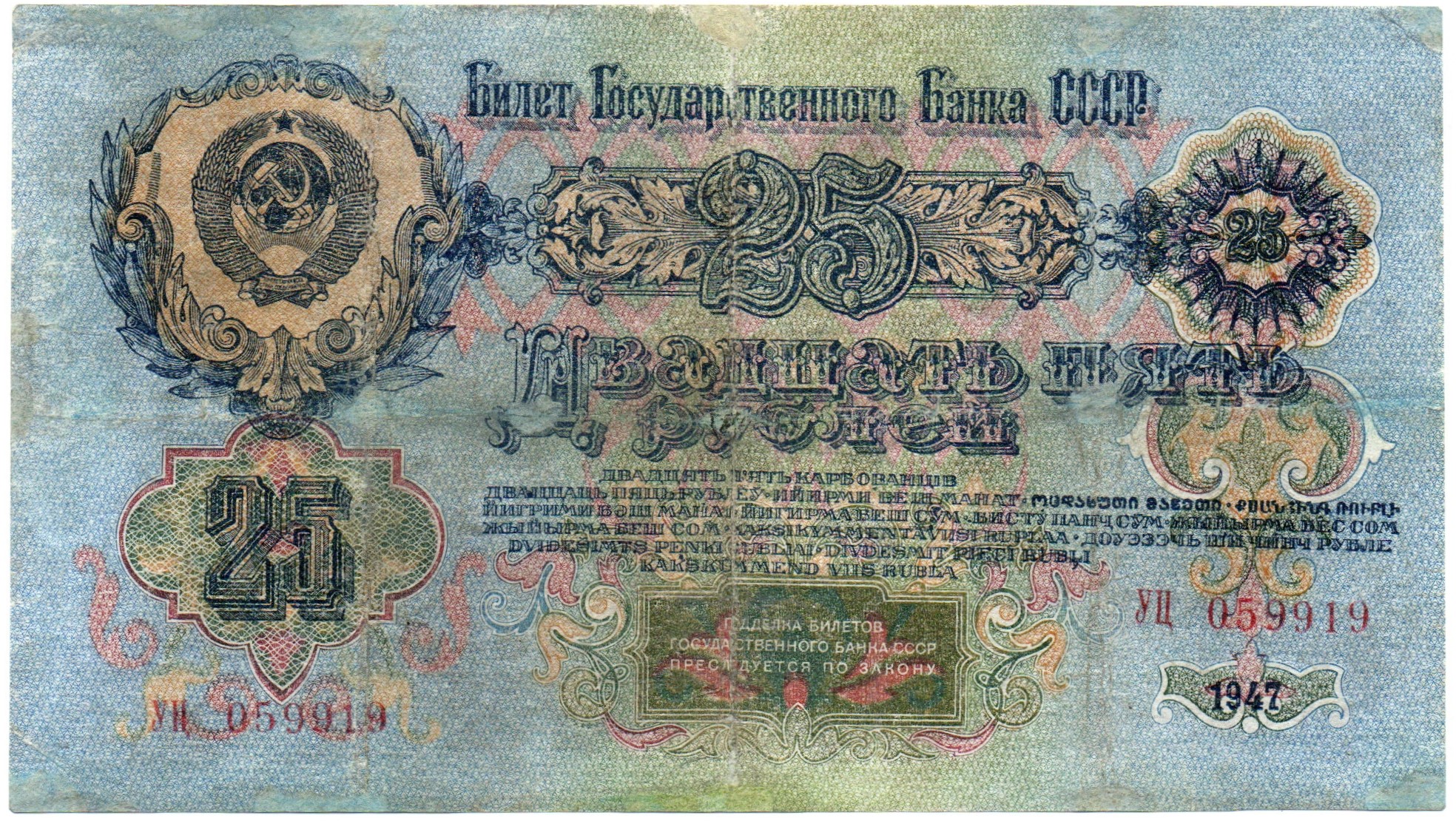 25 рублей 1947 год. Билет Госбанка СССР. УЦ 059919