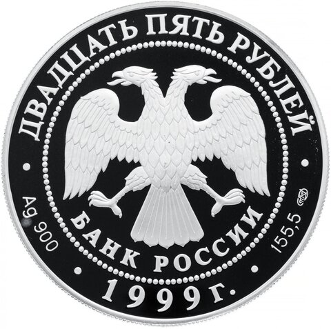 Аверс: в центре диска — эмблема Банка России (двуглавый орёл художника И.Билибина, под ним надпись полукругом «БАНК РОССИИ», обрамлённая кругом из точек и надписями по кругу:вверху — «ДВАДЦАТЬ ПЯТЬ РУБЛЕЙ», внизу — «1999 г.», слева — обозначение металла, проба сплава, справа — содержание драгоценного металла в чистоте и товарный знак монетного двора.